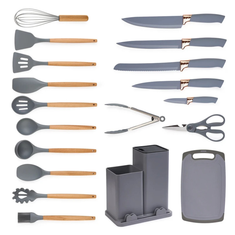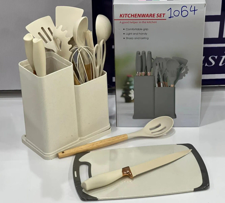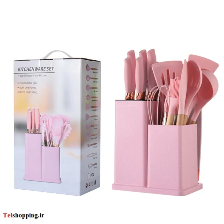 کفگیر ملاقه سیلیکونی و سرویس چاقو به همراه تخته گوشت ۱۹ پارچه