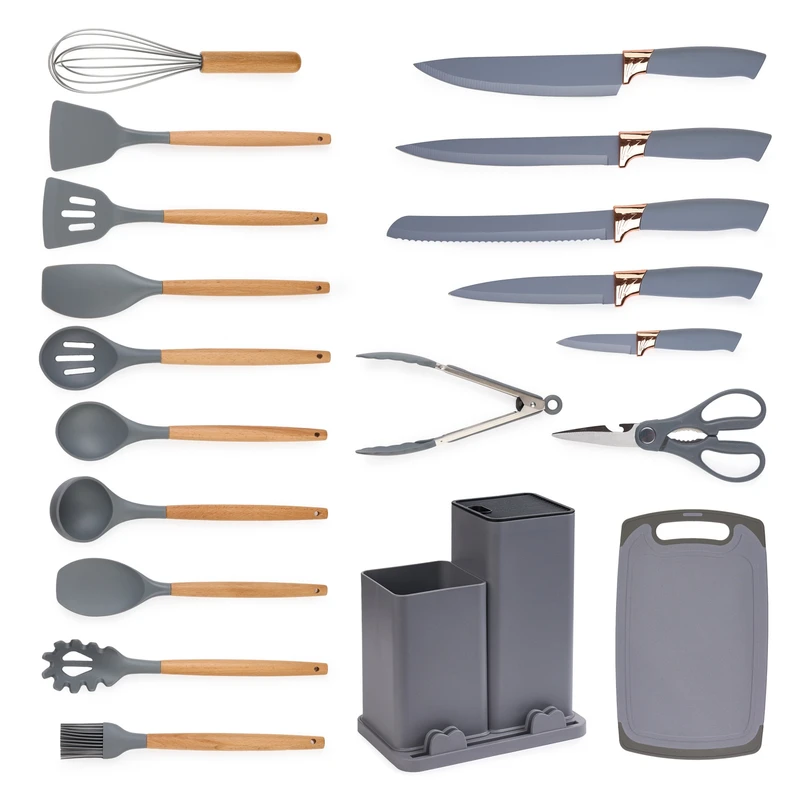 کفگیر ملاقه سیلیکونی و سرویس چاقو به همراه تخته گوشت ۱۹ پارچه